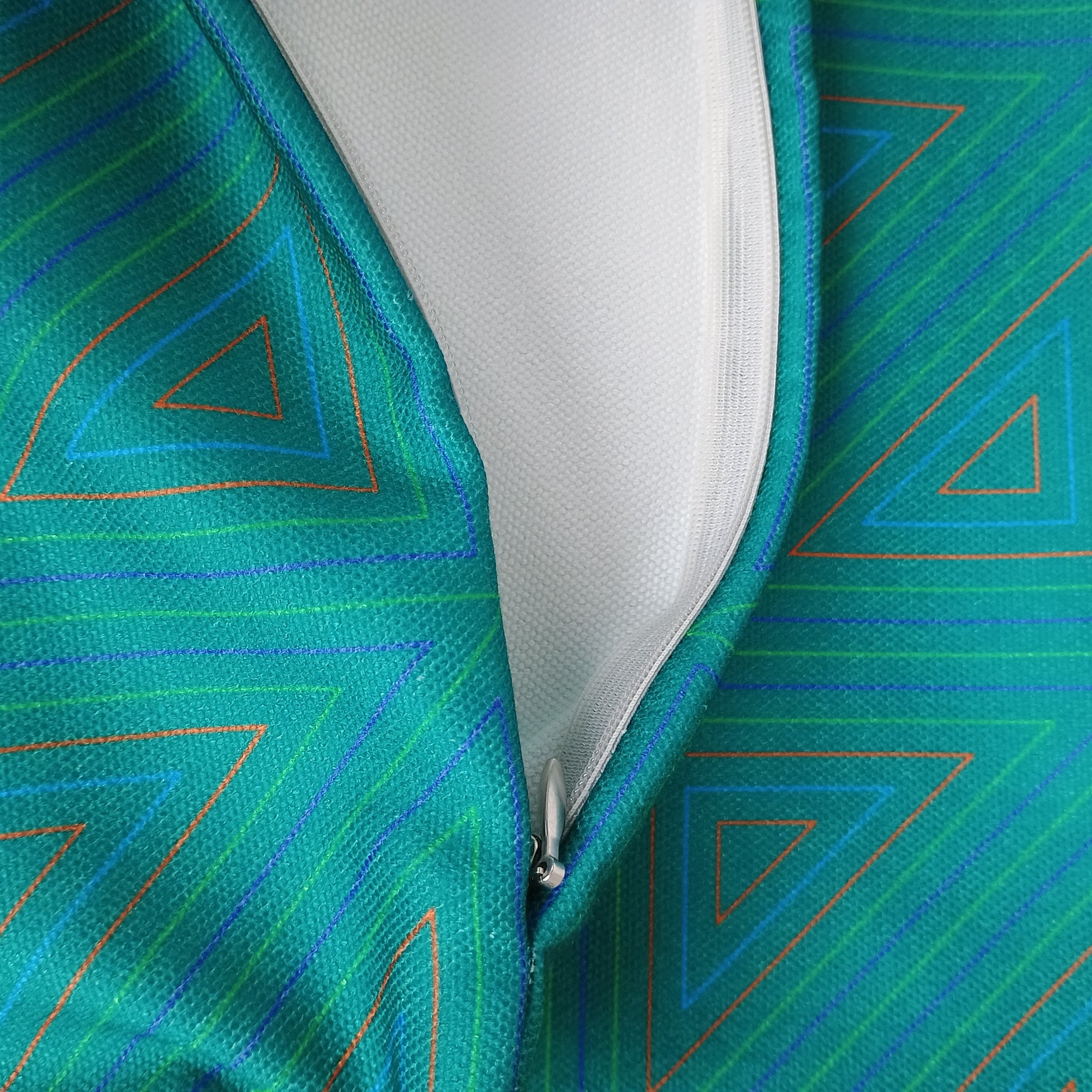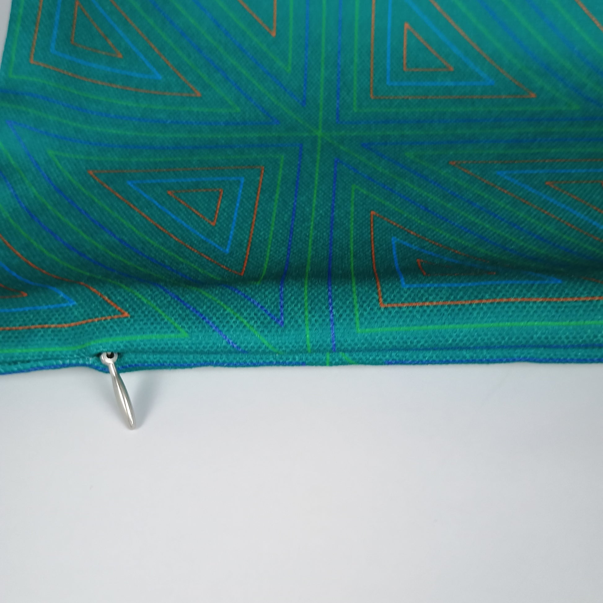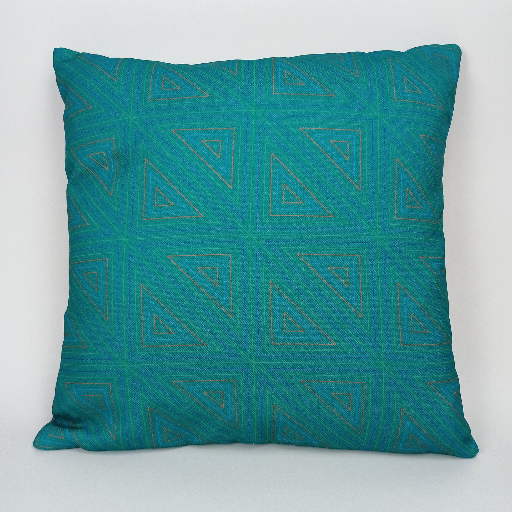 Elevate your interior with this striking 40 x 40 cm double face cushion, featuring a sophisticated geometric design of interlocking triangles in bluish-green tones complemented by contrasting accent colors.