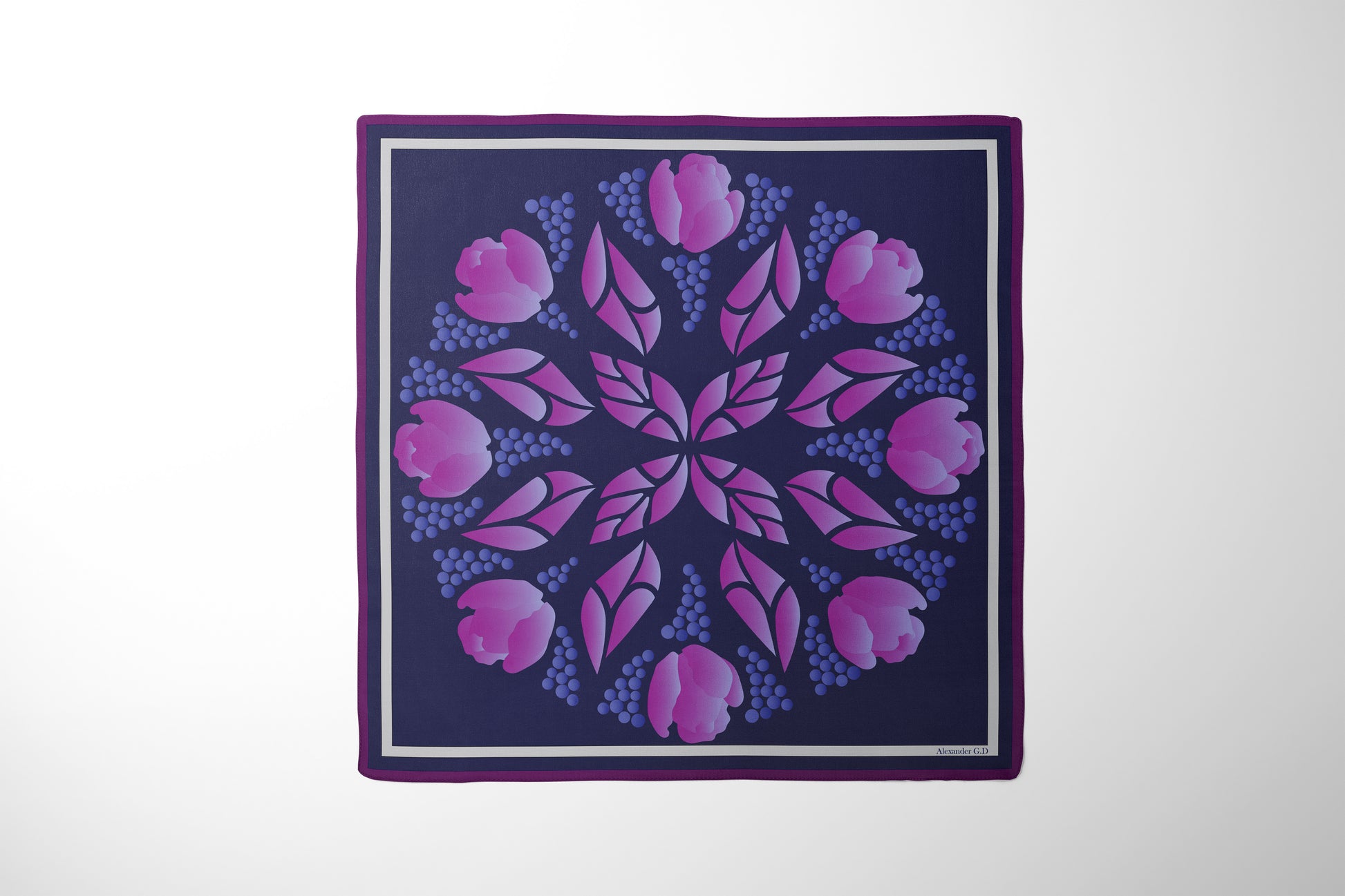 Elevate your outfit with this sophisticated silk twill scarf, featuring an exquisite tulip design. The timeless floral motif brings botanical elegance, whether styled as a neck scarf, headpiece, or decorative accent. Perfect for those who appreciate refined craftsmanship and understated luxury in their accessories.